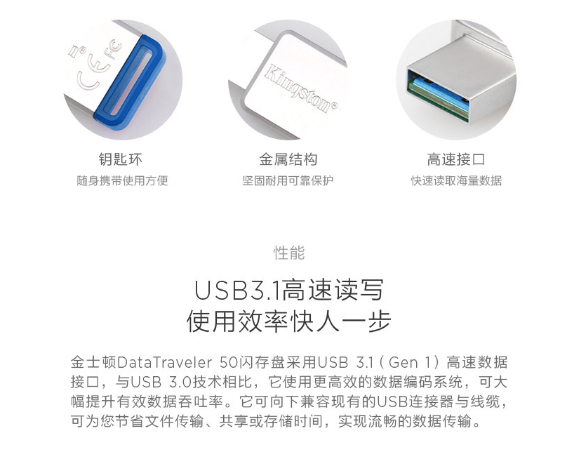 金士頓(Kingston)128GB USB3.1 U盤 DT50 黑色 金屬外殼 無蓋設(shè)計(jì)